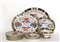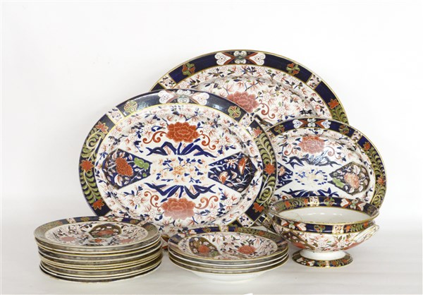 Manifatura del secolo XIX, parte di servizio di piatti in porcellana decorata in policromia nello stile Imari composto da: tre piatti da portata ovali, una zuppiera, quattro piatti fondi e dieci piatti piani (difetti, restauri e mancanze)