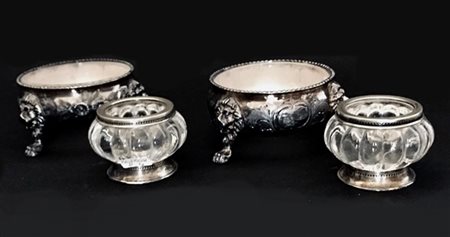 Lotto composto da due coppie di saliere in metallo e argento con vaschette in vetro (lievi difetti)