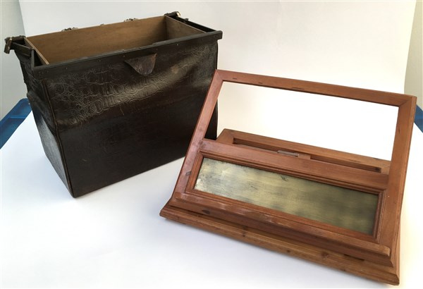 Lotto composto da un leggio e un gettacarte ricavato da una borsa in cuoio (dif