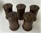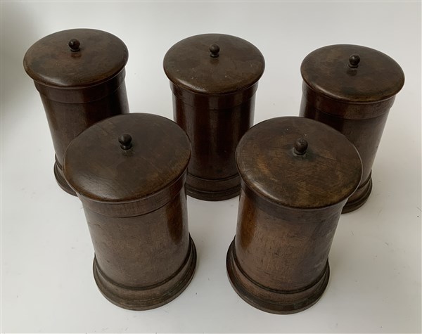 Gruppo di cinque contenitori in legno tornito con coperchio, secolo XIX (h cm 22) (difetti)