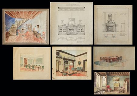 Lotto di sette disegni a matita, carboncino ed acquarello raffiguranti progetti per arredamento, autori e misure diverse (difetti)