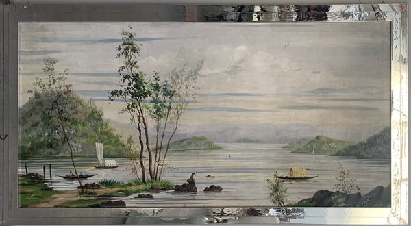 Ignoto, "Paesaggio lacustre", olio su tela (cm 75x150) in cornice (difetti)