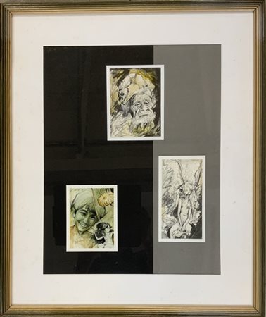 Enrico Ceriani - Tre disegni raffiguranti gnomi e ninfe, tecnica mista su carta di misure differenti, in unica cornice (lievi difetti)