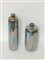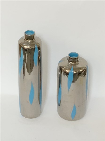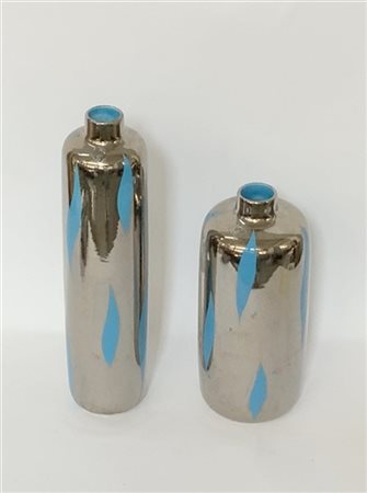 Lotto di due vasi in ceramica smaltata color argento con decori azzurri (h max