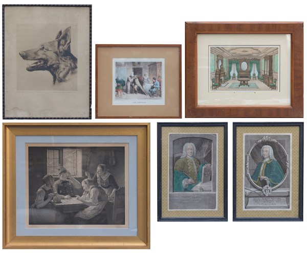 Lotto composto da due antiche incisioni, un acquaforte e tre litografie di sogg