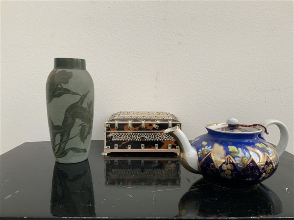 Lotto composto da un vaso in pietra verde, una scatolina in osso e una teiera in porcellana, manifatture diverse