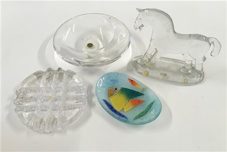 Lotto composto da un cavallino in cristallo recante etichetta cartacea adesiva Kosta Boda unito a tre posaceneri di epoche e manifatture differenti. (lievi difetti)