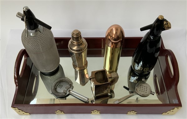 Lotto composto da un vassoio con piano a specchio, due shaker, due sifoni per s