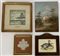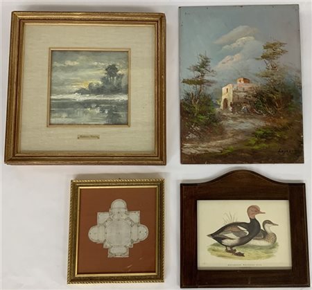 Lotto composto da due dipinti ad olio firmati Italo Simoni e Lopez, una stampa raffigurante anatre e un disegno di una pianta di basilica (difetti)