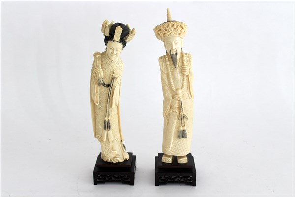 Due sculture in avorio raffiguranti Imperatore e Imperatrice, basi in legno (h.