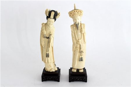 Due sculture in avorio raffiguranti Imperatore e Imperatrice, basi in legno (h. cm 31) (lievi difetti)