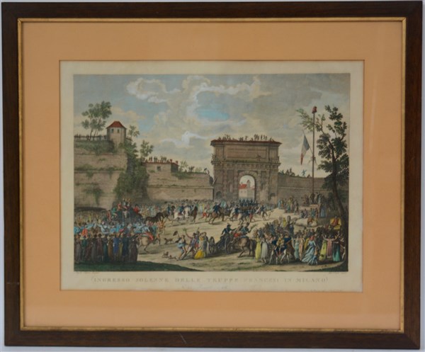 Incisione acquerellata del sec. XIX raffigurante l'ingresso delle truppe francesi a Milano (cm 46x57) in cornice (difetti)