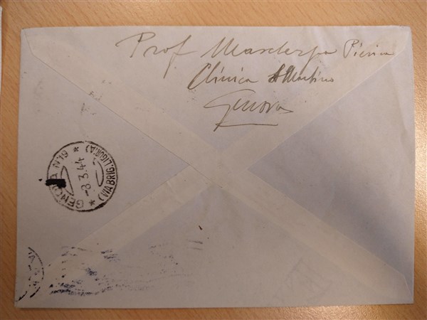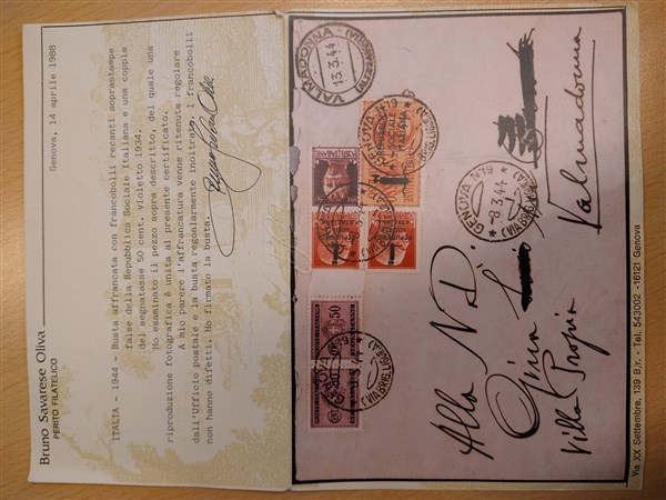 Busta da Genova per Valmadonna affrancata con un espresso con soprastampa capovolta, una coppia di segnatasse e altri valori. Da esaminare
