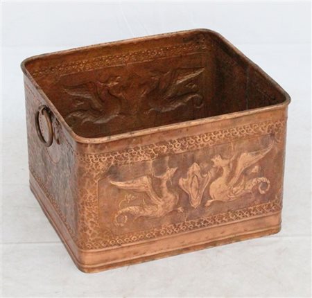 Fioriera biansata in rame sbalzato e martellato decorato con figure di draghi alati (cm 47x31x43) (difetti)
