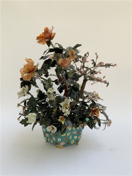 Pianta in pietra dura con vaso di forma polilobata in metallo cloisonnè