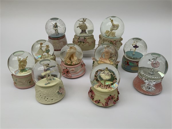 Gruppo di undici boules de neige con carillon a tema danza classica. Vetro e resina policroma (h max cm 16) (difetti)