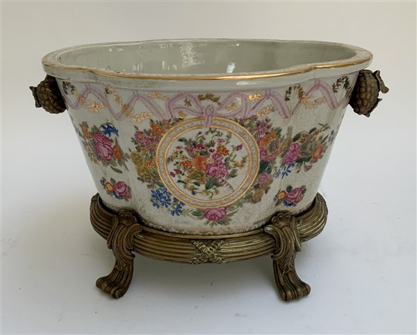 Rinfrescatoio biansato in porcellana decorato a fiori policromi e dorature con anse e base in bronzo (cm 26x40)