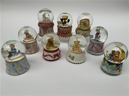 Gruppo di nove carillon boules de neige di soggetti differenti. Vetro e resina policroma (h cm 17) (difetti)