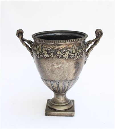 Vaso biansato in metallo argentato con decoro a baccellature e rami d'edera in rilievo. Inizio secolo XX (h cm 30) (difetti)