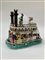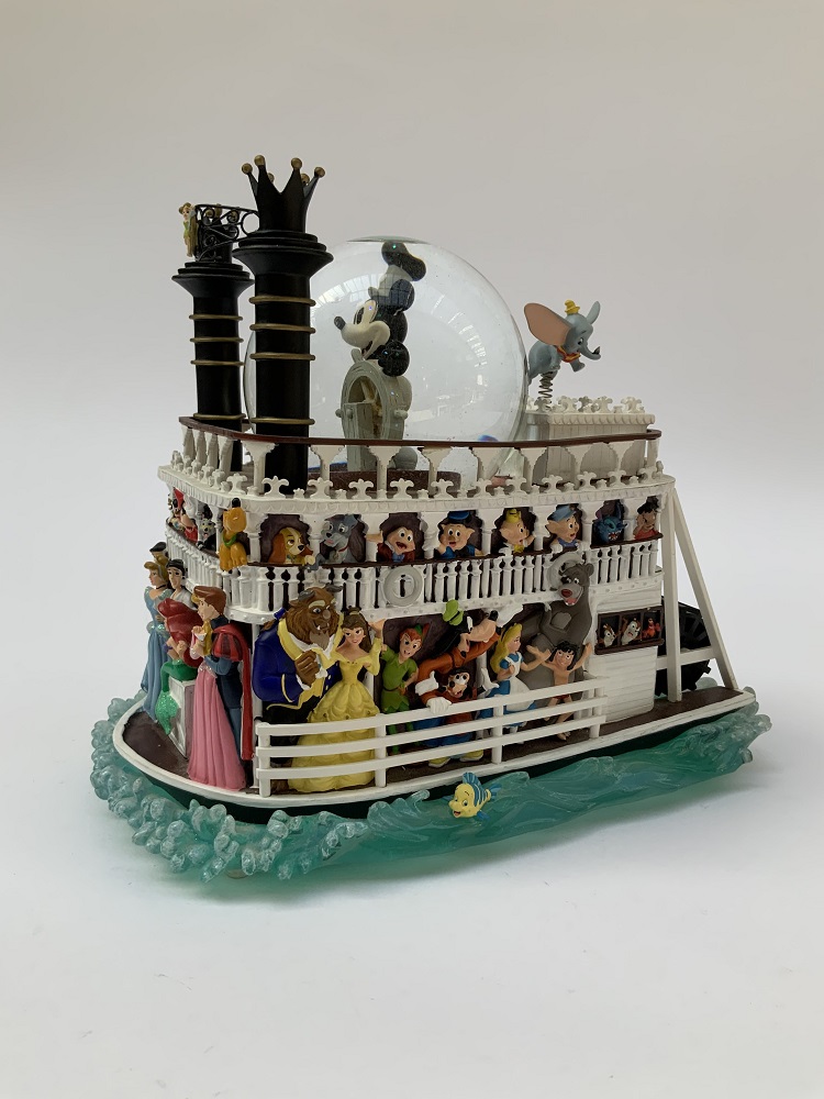 Carillon Disney con snow globe a tema Mickey Mouse sul battello con i protagionisti di altre storie. Vetro e resina policroma (h cm 25) (difetti e restauri)