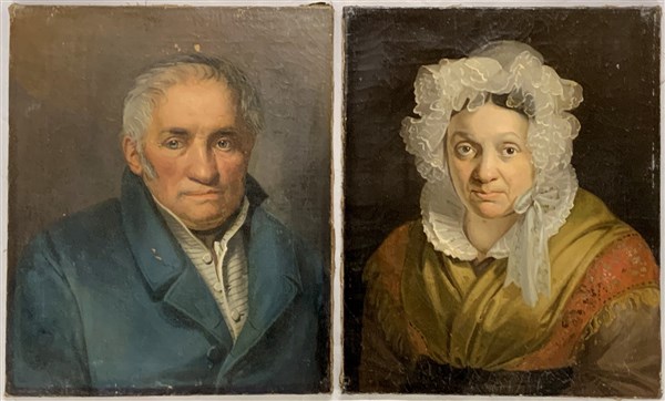 Coppia di dipinti ad olio su tela raffiguranti "Ritratto maschile" datato 1831 e firmato al retro e "Ritratto femminile" datato 1833 e firmato al retro (cm 50x41)