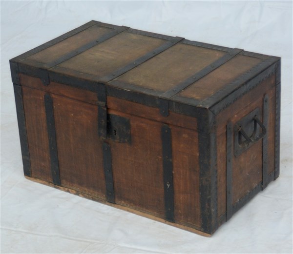 Baule a "forziere" in legno con applicazioni in ferro (cm 71x40,5x40,5) (difetti)