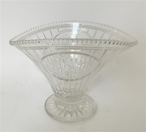 Vaso in cristallo inciso a forma di cesto decorato con uccelli su rami fioriti, inizio secolo XX (h cm 24) (difetti)