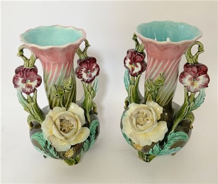 Coppia di vasi in ceramica policroma con anse a forma di violette e corpi decorati con rose e boccioli in altorilievo. (h cm 24,5) (difetti)