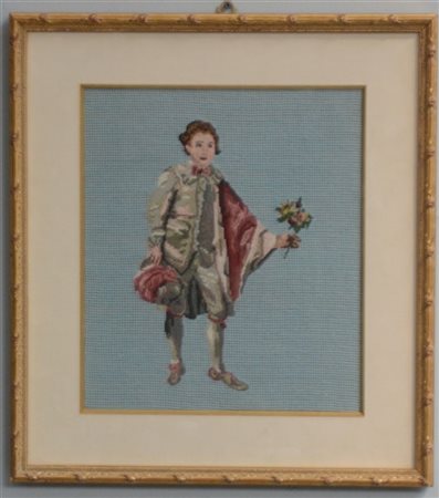 Ricamo piccolo e piccolissimo punto raffigurante gentiluomo su fondo azzurro. I