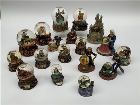 Gruppo di diciotto boules de neige di cui quattro con carillon a tema maghi, fattucchiera e Halloween, fra cui due a soggetto Harry Potter. Vetro e resina policroma (h max cm (lievi difetti)