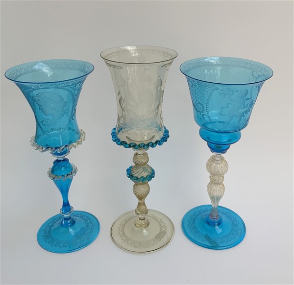 Manifattura di Murano, lotto di tre calici in vetro soffiato e acidato a profil