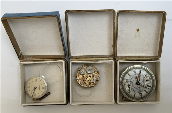 Lotto composto da tre movimenti con quadranti di orologi, misure diverse (difetti)