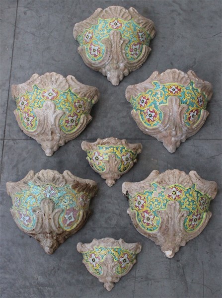 Gruppo di sette vasi a muro decorati a motivi rinascimentali, misure diverse (max cm 55x40) (difetti)