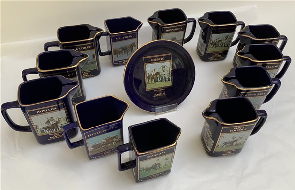 Gruppo di dodici brocche in ceramica blue e oro, prodotte in serie limitata decorate con immagini di corse di cavalli (lievi difetti)