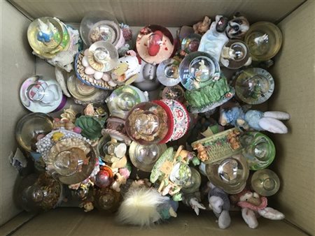 Cartone contenente numerose boules de neige di differenti soggetti e dimensioni