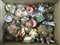 Cartone contenente numerose boules de neige di differenti soggetti e dimensioni. Vetro e resina policroma (difetti)