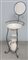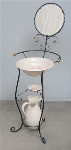 Portacatino con specchio in ferro battuto decorato con pomoli in bronzo completo di servizio da toilette in ceramica di Deruta composto da catino, brocca e portasapone, decorati a figura di "amorini" in monocromia (d cm 49, h cm 128) (difetti)