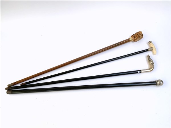 Lotto di quattro bastoni da passeggio di materiali differenti, uno contenente p