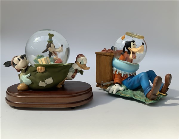 Due carillon Disney con snow globe raffiguranti Topolino, Paperino e Pluto. Vet