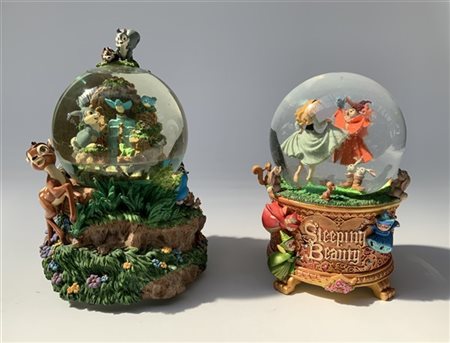 Due carillon Disney con snow globe a tema "Bambi" e "La bella addormentata nel bosco". Vetro e resina policroma (h max cm 22) (difetti)