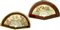 Due ventagli in teche con pagine decorate e dipinte con secne popolari. Stecche