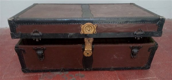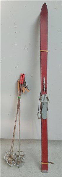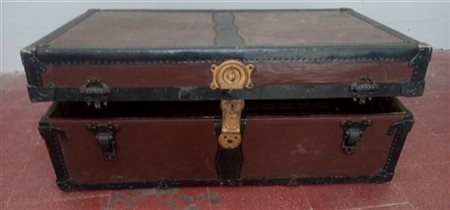 Lotto composto da un baule e una coppia di sci in legno con quattro racchette v