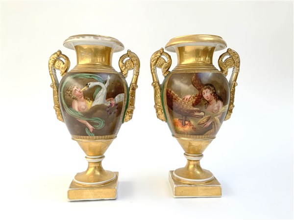 Manifattura francese, coppia di vasi biansati in porcellana a decoro verde e oro, dipinti con scene mitologiche. Secolo XIX (h cm 29) (difetti)