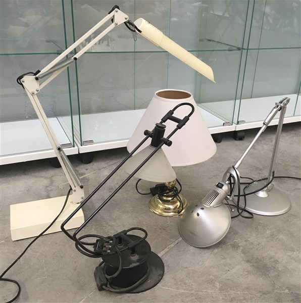 Lotto composto da quattro lampade da tavolo, di cui tre con bracci snodabili di epoche e produzioni differenti. (lievi difetti)