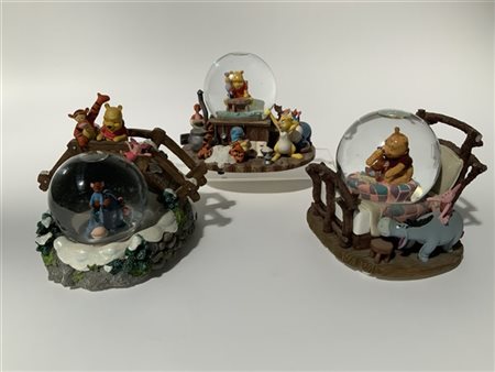 Tre carillon Disney con snow globe a tema "Winnie the Pooh". Vetro e resina policroma (h max cm 15) (lievi difetti)