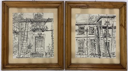 Ignoto, coppia di disegni a china raffiguranti "Scorci di edifici" (cm 31x28).