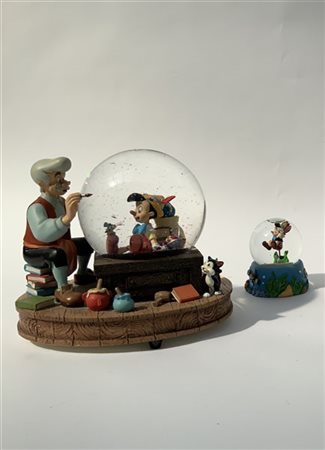 Lotto composto da un carillon e un souvenire Disney con snow globe a tema "Pinocchio". Vetro e resina policroma (h cm 21) (lievi difetti e piccoli restauri)