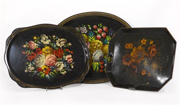 Lotto di tre vassoi di diversa forma in metallo laccato a fondo nero decorato in policromia a fiori (difetti)