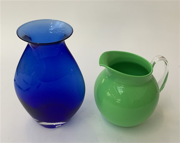 Lotto composto da un vaso in vetro trasparente blu a bocca svasata e una brocca di Massimo Giusti in plastica verde (h max cm 31) (lievi difetti)