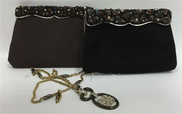 Lotto di due clutch marroni, una in velluto e una in gros con chiusura in strass e perle fancy nei toni dell'ambra e marrone unite a una collana color oro (segni d'uso)